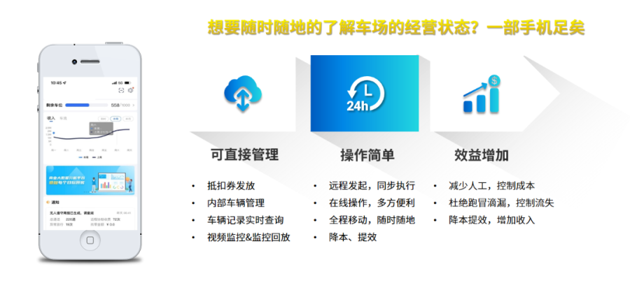 - 此外,想要隨時隨地了解車場的運營情況,僅需一個停車場云助手APP就能實現(xiàn)車場、設(shè)備、系統(tǒng)管理。無論在何種場景,管理員通過APP打開“視頻監(jiān)控”功能,就可實時查看街區(qū)內(nèi)所有出入口的情況。不僅如此,車場管理方用手機即可接收運營報表、異常報警等信息,停車場日常數(shù)據(jù)清算及對賬工作均由系統(tǒng)自動完成,不僅滿足了車道上的所有管理需求,同時還降低了車場的管理成本,真正做到對車場賦能,讓企業(yè)收益。