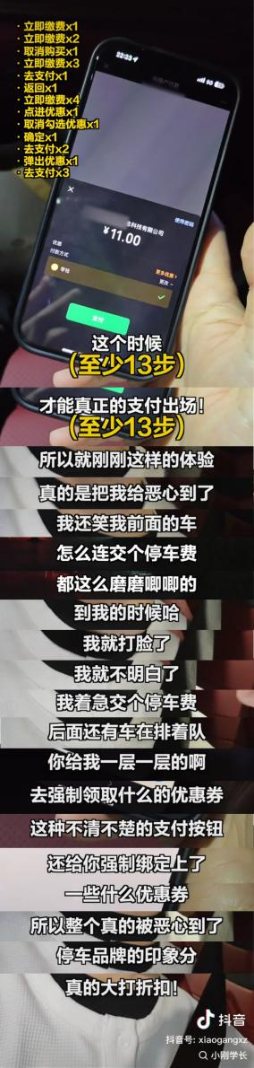 - 不少網(wǎng)友吐槽,自己在掃碼繳納停車費(fèi)時(shí)體驗(yàn)感不佳,明明輸入車牌號就可以付錢的小程序,卻還要和隨時(shí)彈出的廣告和所謂的“優(yōu)惠活動”斗智斗勇。網(wǎng)友A就曾有過這樣的經(jīng)歷:掃碼跳轉(zhuǎn)至繳費(fèi)頁面,在“立即繳費(fèi)x元”的下方,有一個(gè)白色框?qū)懹小邦I(lǐng)取5元券本次停車可用”的字樣,點(diǎn)擊“確認(rèn)”后,竟自動跳轉(zhuǎn)至廣告鏈接,上面提示,車主需要綁定支付寶并開通自動包月服務(wù),才可領(lǐng)取到5元的停車抵用券。這樣一頓操作下來,全程下來需要花費(fèi)大約5分鐘,且還不一定能成功領(lǐng)取抵用券。而網(wǎng)友B則是遇到過直接誘導(dǎo)消費(fèi)的問題,停車兩小時(shí),花費(fèi)8元,但在繳費(fèi)時(shí)出現(xiàn)了某某TV廣告鏈接,點(diǎn)進(jìn)去后被扣了5元錢,工作人員告知費(fèi)用是由第三方支付平臺扣除的,網(wǎng)友B只好吃了啞巴虧。類似以上這樣額外捆綁的行為頻頻發(fā)生,給用戶帶來了不必要的干擾和困擾。